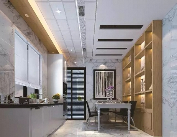 陶紋色的板材使整個頂部空間具有原生態的韻味,洋溢著人文氣息的陶土紋理板材,做工精密細致,傳達著一種簡約、自然而又時尚的生活態度。